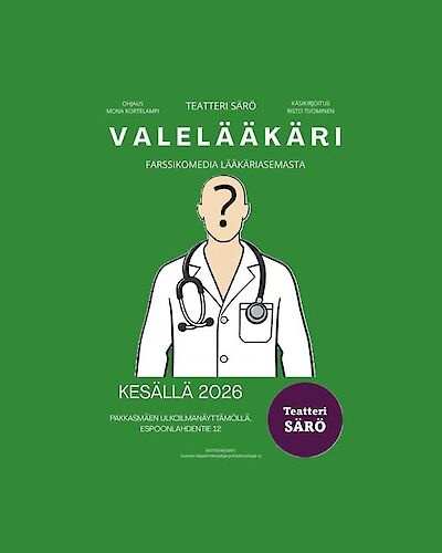 Teatteri Särö esittää kesäteatterissa hulvattoman näytelmän Valelääkäri, jossa väärät diagnoosit, suuret egot ja pienet valheet eskaloituvat farssiksi, joka ei jätä vatsalihaksia rauhaan. Kun yksi valhe riittää käynnistämään kaaoksen, voi vain arvata, mihin kaikkeen päädytään, kun lääkäri ei olekaan ihan sitä, mitä väittää. Tässä esityksessä nauretaan, nolostellaan ja pelastetaan tilanne viime hetkellä – tai sitten ei. Kesäteatterin lavalla nähdään värikkäitä hahmoja, yllättäviä käänteitä ja dialogia, joka iskee suoraan nauruhermoon. Sopii erinomaisesti ystäväporukoille, pariskunnille, työporukoille ja kaikille, joilla on lupa nauraa ääneen.
